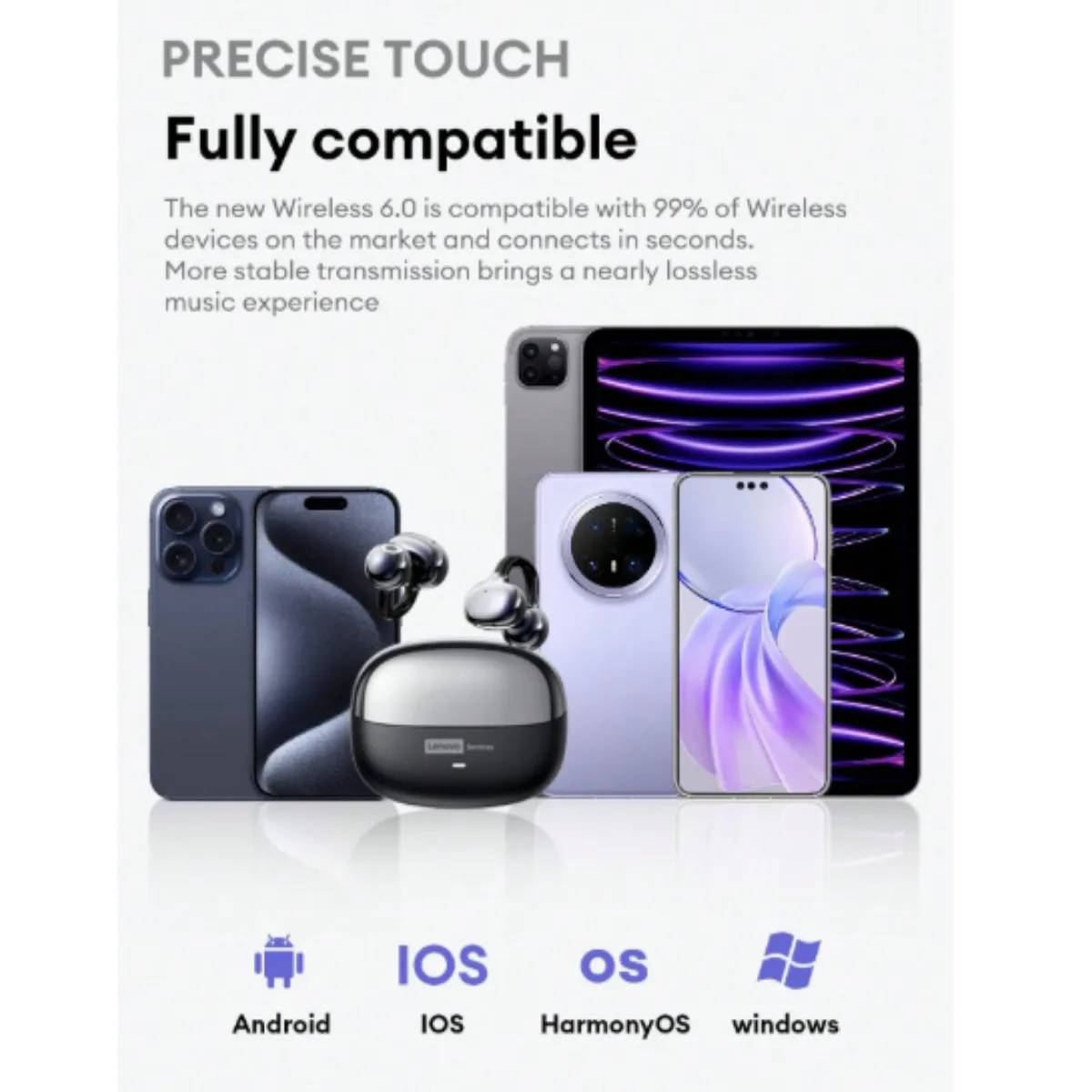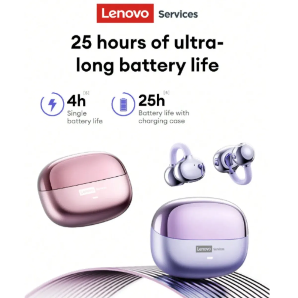 Auriculares Bluetooth Lenovo LE302 de diseño abierto tipo clip, cómodos y ligeros, ideales para deporte y uso diario. Ofrecen sonido estéreo envolvente, cancelación de ruido ENC para llamadas claras y baja latencia para música y juegos. Resistentes al sudor (IPX4) y compatibles con Android, iPhone y computadoras.