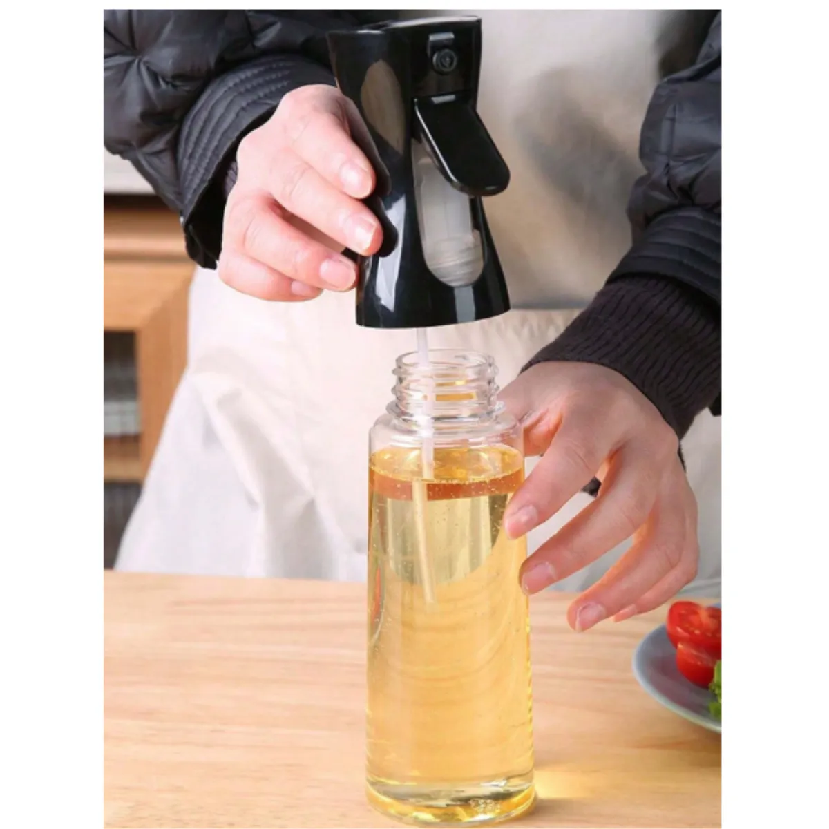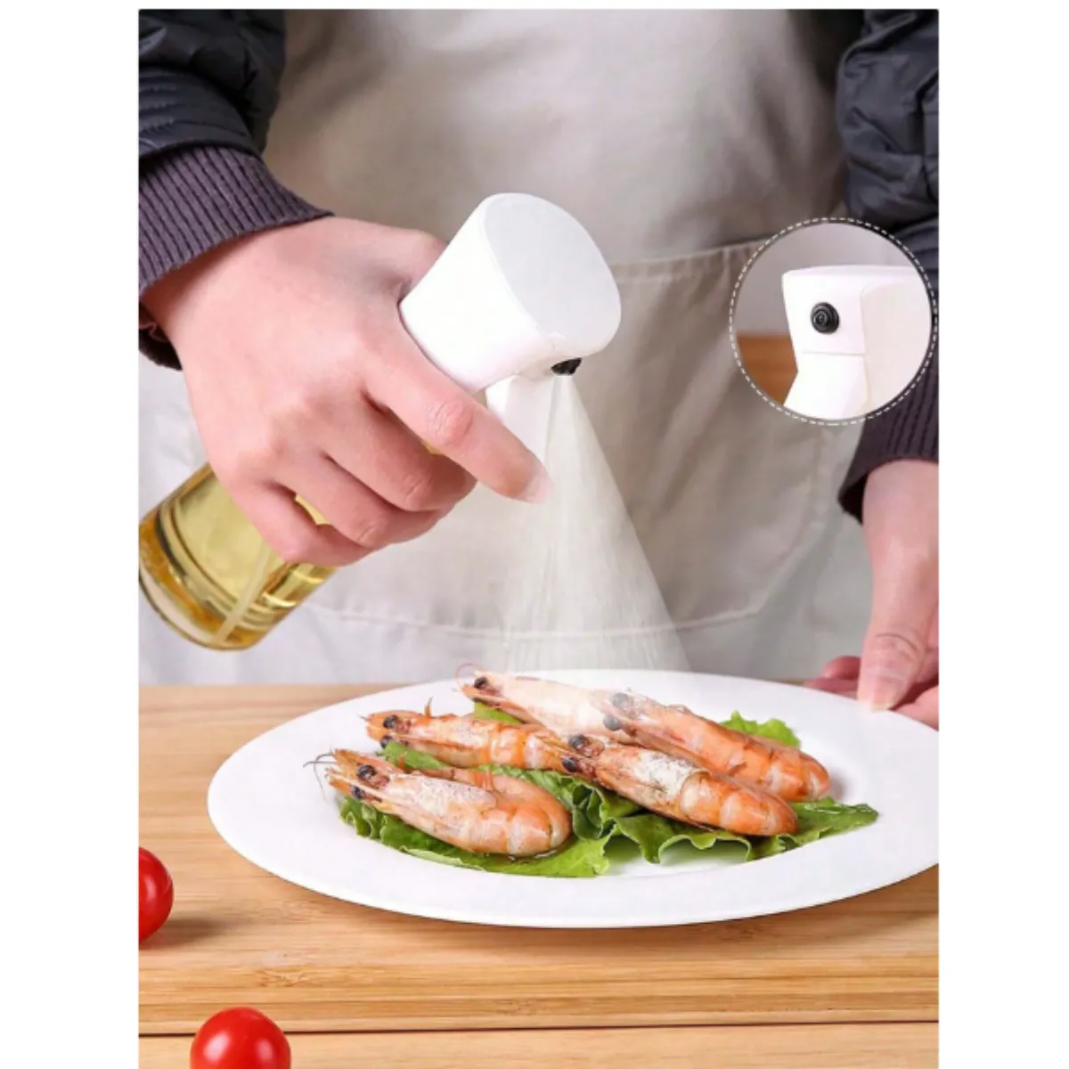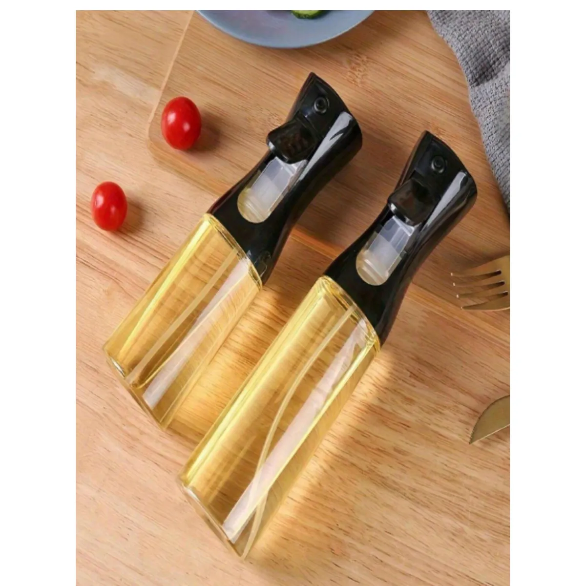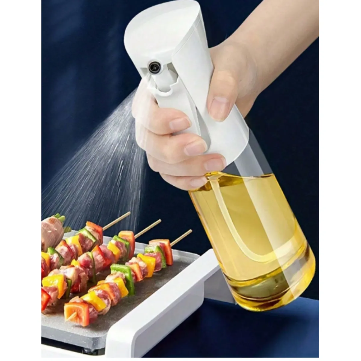 Botella rociadora de aceite, ideal para cocinar con menos grasa. Su pulverización fina permite aplicar aceite de forma uniforme en sartenes, parrillas, freidoras de aire y ensaladas. Perfecta para uso en cocina o barbacoas al aire libre.
