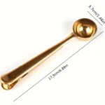 Cuchara de café 2 en 1 en acero inoxidable dorado. Combina cuchara medidora y clip sellante en un diseño elegante, duradero y funcional, ideal para conservar la frescura del café o té.