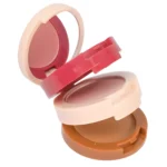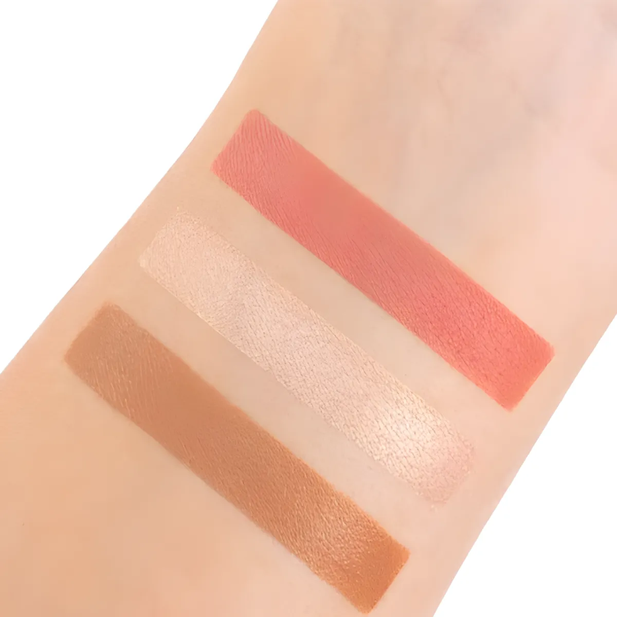 Paleta compacta 3 en 1 con rubor, iluminador y bronzer en tonos cálidos. Su textura suave y ligera ofrece buena adherencia y duración, ideal para un maquillaje completo en cualquier momento. Incluye espejo para retoques fáciles donde estés.